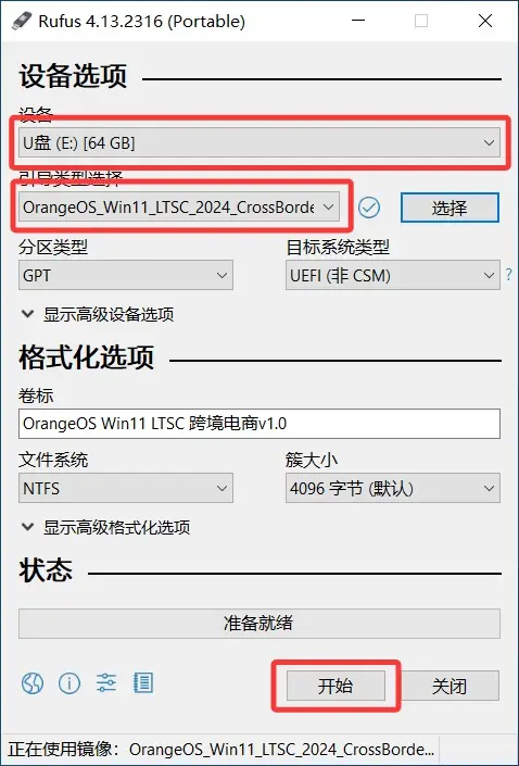 镜像写入操作:打开 Rufus,插上 U 盘。在“设备”一栏确认选的是你的 U 盘。点击右侧的 【选择】,找到你下载好的 OrangeOS_Win11_LTSC_2024_CrossBorder_x64_v1.0.iso 镜像。其他选项默认(通常会自动识别为 GPT 和 UEFI),点击底部的 【开始】。