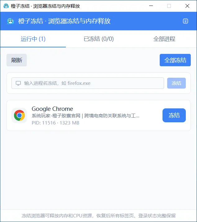 firefox.exe),即可搜索并冻结匹配的进程。支持部分匹配和自动补全 .exe 后缀,不在预置列表中的浏览器、甚至非浏览器类应用程序都可以冻结。%AppData%\OrangeFreeze\,删除该目录即可完全清理。即开即用,无需注册。